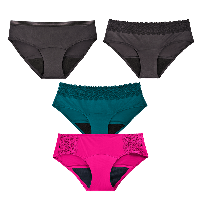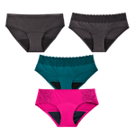 Contiene: 1 Panty Hipster Fuscia - Flujo Abundante + 1 Panty Hipster Azúl +  1 Panty Hipster Negro + 1 Panty Bikini Negro - Flujo Regular