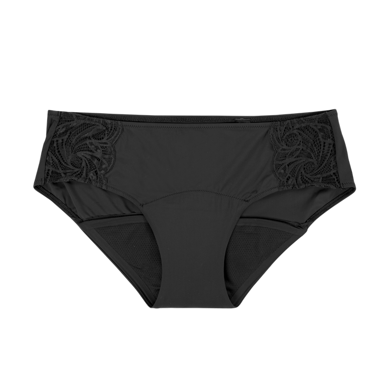 El estilo Hipster cuenta con un encaje en la cintura y su forma cubre un poco más la cadera que el bikini. Su absorción es de 8 a 12 horas según la cantidad de flujo.